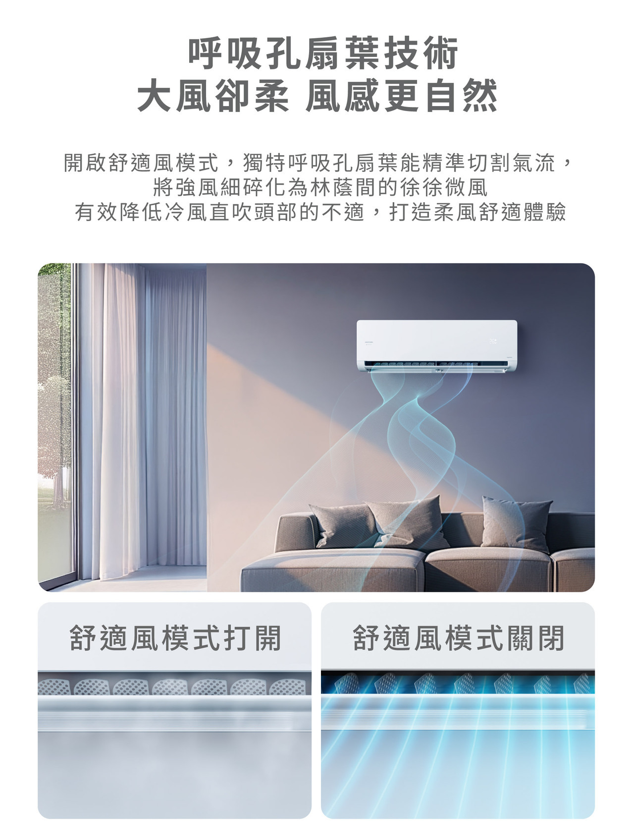 ●呼吸孔舒適柔風扇葉設計